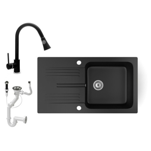 1 kép Gránit mosogató NERO Malta + kihúzható zuhanyfejes Snake csaptelep + dugókiemelő (matt fekete)