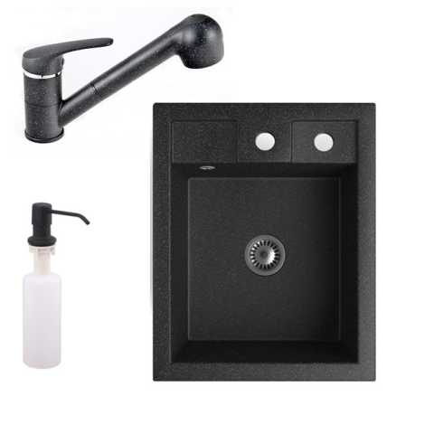 1 kép Gránit mosogató NERO Parma + kihúzható zuhanyfejes Shower csaptelep + adagoló + szifon (fekete)