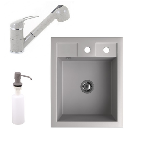 1 kép Gránit Mosogató NERO Parma + kihúzható zuhanyfejes Shower csaptelep + adagoló + szifon (szürke)