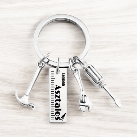 Gravírozott fém kulcstartó, szerszámokkal. Méret:6 cm Legjobb aszatalos felirattal. A szöveg nem módosítható!