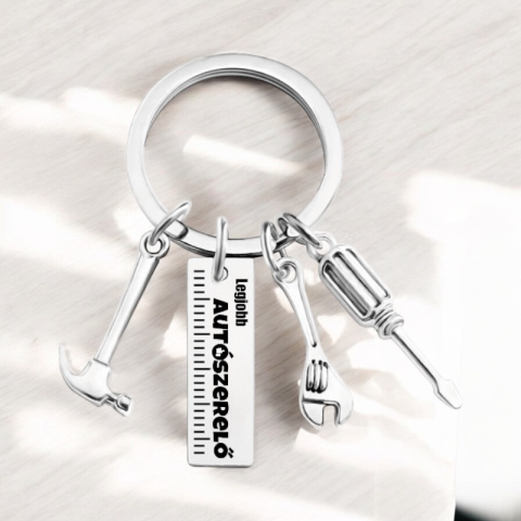 Gravírozott fém kulcstartó, szerszámokkal. Méret:6.5 cm Legjobb autószerelő felirattal. A szöveg nem módosítható!