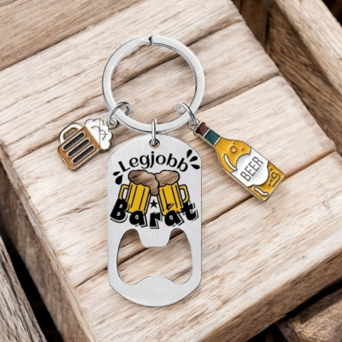 Gravírozott fém kulcstartó, sörnyitóval. Méret: 8.5cm Legjobb barát felirattal. A szöveg nem módosítható!