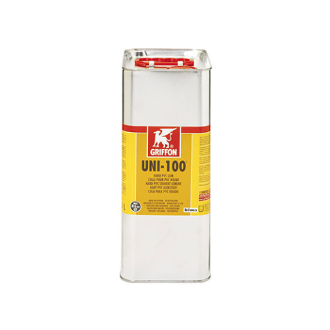Griffon UNI-100 PVC ragasztó – Erős és megbízható kötés kemény PVC-hez - 5000ml A Griffon UNI-100 egy kiváló minőségű PVC ragasztó, amelyet elvezető és nyomás alatt lévő rendszerekhez terveztek. Ideális csatlakozások, fittingek és szerelvények rögzítésér