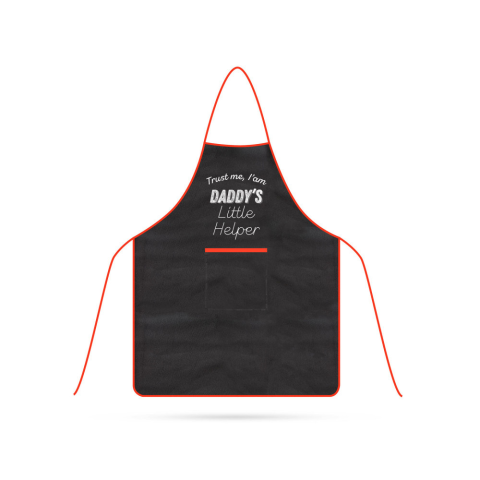 Grill kötény - gyerek méret - 44 x 60 cm - fekete Praktikus kiegészítője a kerti sütögetésnek. Megvédi ruháját a zsírfoltoktól. Poliészter anyaga vízlepergető hatással bír. A középen lévő nagyméretű zsebben mindig magánál tudhatja a legfontosabb BBQ ke