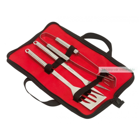 Grill szett:rozsdamentes acél lapáttal,villával és fogóval,cipzáras táskában,fülekkel. Méret: 40 x 12 x 6 cm Rendelésre: 5-10 nap! Szín: vörös, fekete Anyag: Rozsdamentes acél / Műanyag Nettó súly: 0,423kg Bruttó súly: 0,453kg Emblémázási mód és mé