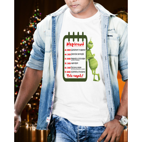 Grincses póló, karácsonyi napirend. Vicces póló az örök kedvenc grinccsel, aki most egy pólón a napirendejét is megmutatja. Ha szeretnél mások arcára mosolyt csalni karácsonykor egy ajándékkal vagy egy humoros pólóval, ez lesz számodra a legjobb választás