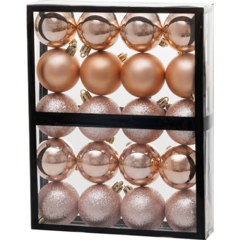 Súprava ozdôb na stromček slúži na slávnostné ozdobenie vianočného stromčeka. Pozostáva z 20 ks guľatých vianočných ozdôb s priemerom 5 cm. Ozdoby majú ružovo-zlatú farbu a sú vyrobené z plastu.