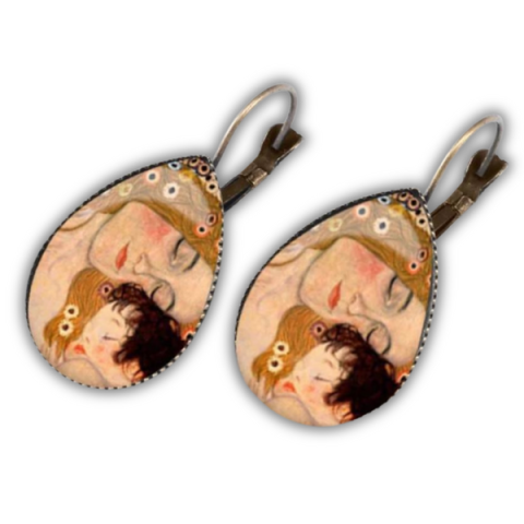 Elegáns Gustav Klimt Anya és gyermeke motívumos fülbevaló. Tökéletes ajándék édesanyáknak, anyák napjára vagy megható alkalmakra
