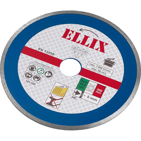 A 200 mm átmérőjű ELLIX gyémánt vágókoronggal csempe vágható és darabolható. Kerámia, csempe, gránit és kőporcelán vágására használható. A korong vastagsága 2 mm. A korong a 22,23 mm-es szabvány furattal rögzíthető a sarokcsiszolóra. Max. 7650 ford./perc fordulatszámmal és max. 80 m/s kerületi sebességgel használható.