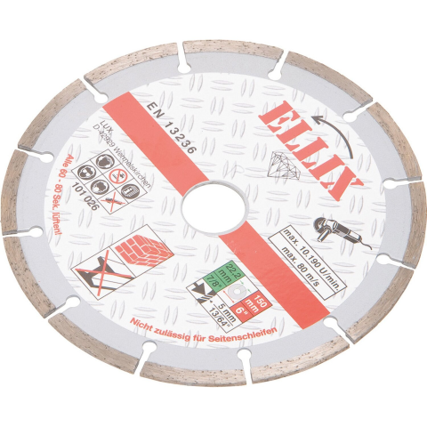 Az ELLIX 150 mm átmérőjű gyémánt vágókorong kövek megmunkálására alkalmas. Gránithoz, betonhoz, falazathoz, kerámiához, térburkoló kövekhez és égetett agyaghoz használható. Szegmentált peremmel rendelkezik. A vágószegmens magassága 7 mm. A korong legfeljebb 10 200/perc (fordulat) teljesítménnyel, ill. legfeljebb 80 m/s kerületi sebességgel használható. A korong 22,23 mm-es szabványos furattal rögzíthető a sarokcsiszolóra.
