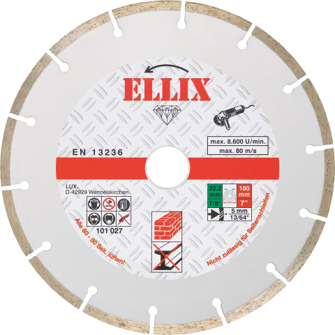 A 180 mm átmérőjű ELLIX gyémánt vágókorong kőzet darabolására alkalmas. Gránit, beton, falazat, kerámia, járdalapok és égetett agyag megmunkálására alkalmas, és szegmentált peremmel rendelkezik. A vágószegmens magassága 7 mm. A korong legfeljebb 8500 ford./perc fordulatszámon, 80 m/s kerületi sebességgel működtethető. A géptartozék 22,23 mm-es szabvány furattal fogatható fel a sarokcsiszolóra.