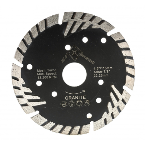 TLS CYCLONE TURBO gyémánt vágókorong Átmérő: d=115 mm Furatátmérő: d=22,23 mm Vágószegmens magasság: 7 mm Vágó szegmens vastagság: 2.5 mm Alkalmazás: száraz és vizes használat Alkalmazási terület: Gránit, márvány, természetes kövek, beton, tégla, csempe,