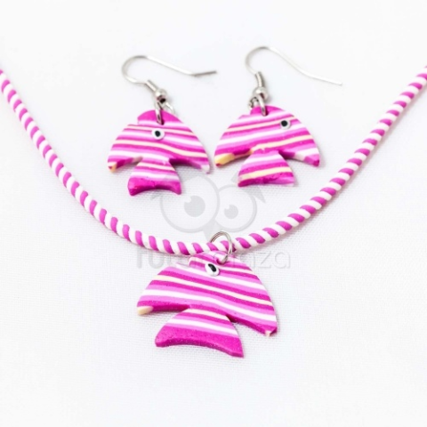 Fashion Gyerek ékszer szett halacskás - pink Kedves gyerek ékszer szett. Anyagának köszönhetően tartós gyermek ékszer, mely a legelevenebb kis angyalok nyakában és fülében is kiállja az idő próbáját. A halacska medál és fülbevaló kedves, játékos kialakítása illetve vidám színei miatt kislányod bármely öltözékéhez illeni fog. Meseszerű ajándék lehet ovis ballagásra is!A hal, mint csillagjegy a tizenkettedik állatövi jegy (02.19-03.20). Vízjegy. A krisztusi