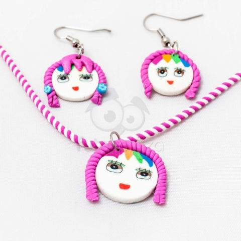 Fashion Gyerek ékszer szett kislányos - pink Kedves gyerek ékszer szett. Anyagának köszönhetően tartós gyermek ékszer, mely a legelevenebb kis angyalok nyakában és fülében is kiállja az idő próbáját. A kislány fejt ábrázoló medál és fülbevaló kedves, játékos kialakítása illetve vidám színei miatt kislányod bármely öltözékéhez illeni fog. Meseszerű ajándék lehet ovis ballagásra is!A lánc hossza: 38 cmA medál mérete: 3x3 cmA fülbevaló mérete: 2x3 cmA