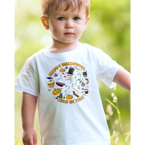 Gyerek póló Halloweenre, csokit vagy csalunk. Népszerű mintáink egyike amiben stílusosan kívánhatsz Boldog Halloweent, tökéletes választás minden gyereknek. Happy Halloween dekoratív és tartós minta, ami olyan technológiával készül, hogy nyugodtan moshato