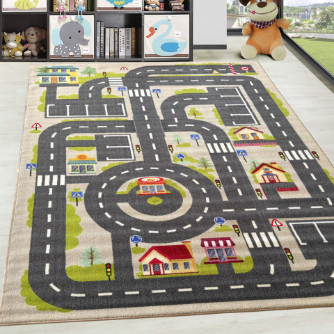 Bézs autópályás gyerekszőnyeg – Tökéletes választás kisfiának!** Ez a bézs színű autópályás gyerekszőnyeg garantáltan a kicsik kedvence lesz! Vidám, részletgazdag mintázata autópályákat, jelzőlámpákat és útjelző táblákat