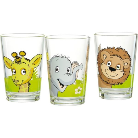 3 darabos Flirt by R&B gyerekpohár készlet, 200 ml űrtartalommal, állatmintával. Minden poháron más kép: zsiráf, elefánt és oroszlán. Mosogatógépben mosható.