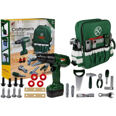 **DIY Hátizsák Eszközkészlet Fúróval** A DIY készlet számos elemet tartalmaz, amely minden kisgyermek számára nagyszerű szórakozást nyújt. A lehetőség, hogy otthoni barkácsolással szórakozzanak, például apukát vagy nagypapát utánozva, felelősségteljes érzést kelt a gyermekben. A bemutatott készlettel való játék pozitívan befolyásolja a gyermek fejlődését – ügyességét, logikai gondolkodását, kreativitását és kézügyességét. A multifunkcionális sz