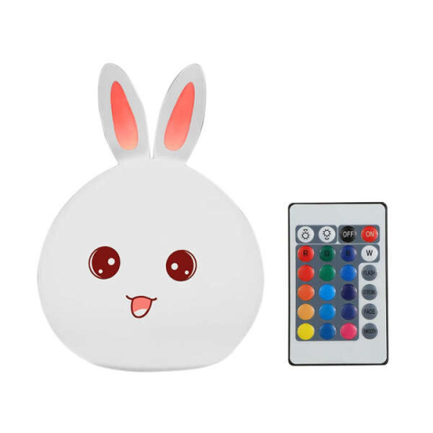 Gyermek éjszakai lámpa 1W nyuszi figura jellemzők: Törésálló Levehető szilikon fedél Könnyen tisztítható Szín: fehér Anyag: szilikon, műanyag 5 árnyalatú háttérvilágítás színe Különböző világítási módok A lámpa fényerejének beállítása Tápegység: beépített 1200mAh újratölthető akkumulátor Teljesítmény: 1W Be-/kikapcsoló gomb a lámpa alján USB-kábel Távirányító Teljes magasság: 15,5cm Mélység: 10cm Szélesség: 12cm Fülek szélessége: 5,5
