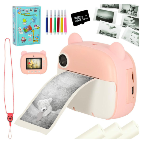 A fényképezőgép fekete-fehér fényképeket nyomtat, amelyeket a gyerekek a mellékelt hat filccel kiszínezhetnek. A készlet három tekercs nyomtatópapírt, egy 32 GB-os memóriakártyát, egy rózsaszín zsinórt és egy USB