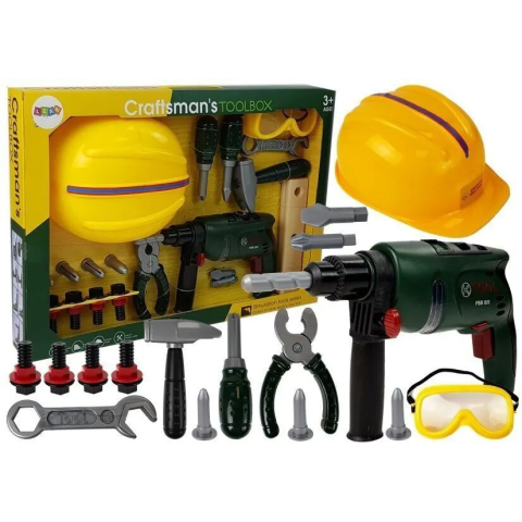 **Mesterkészlet: Akkumulátoros Fúró, Védőszemüveg, Sisak** Ideális készlet a kis barkácsoló számára! A teljes készlet tökéletesen kidolgozott műanyag eszközöket tartalmaz. A fúró minden részletében hasonlít az igazi megfelelőjére. Most a kicsi segíthet apának vagy nagypapának, és megjavíthatja az elromlott játékjárműveket. Egyik hiba sem lesz ijesztő számára. A hiba azonnal javításra kerül. Az összes elem az első lépés ahhoz, hogy a jövőben saját m