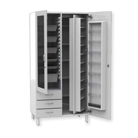 Termék jellemzői: - 24 db gyógyszerrekesszel, egyik oldalán és 6 ISO tálca 1 polccal, 3 fiókkal a másik oldalon - 20 mm vastag kétszerű rétegelt lemezből készült - epoxi porral festett acél alapház, - 4 állítható lábbal, Ø 50 mm - Méret: 96 x 66 x h 195 c