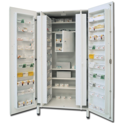 Termék jellemzői: - 20 mm vastag fehér laminált lapból készül - gyógyszeret károlására szolgál - 48 rekesz és 5 állítható fiók - epoxy festett fém váz és állítható fém lábak - 2 zárható ajtóval, ami 180 fokban kihajtható - veszélyes szernek külön zárható