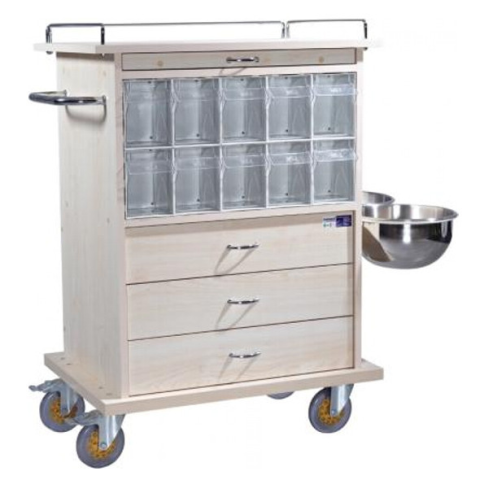 Termék jellemzői: - fa váz - fedlapon oldalvédő korlátok - fém tolókar - gyógyszer előkészítéshet lefelül kihuzható fa lap - 20 áttetsző gyógyszerfiók - két nikkel edény - 3 fa fiók - 2 fékezhető kerék Méret: hossz: 500mm szélesség: 700mm magasság: 1050mm