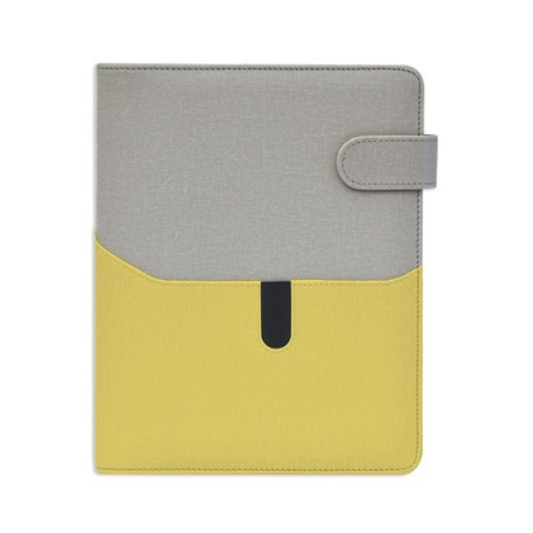 Gyűrűs kalendárium SATURNUS M229 sárga lapos szürke-zöld műbőr 2026. Divatos színösszeállításban, borítóján praktikus zsebbel készült, rejtett mágnessel záródó kalendárium. Szitázással, présfólia- és vaknyomással emblémázható.
