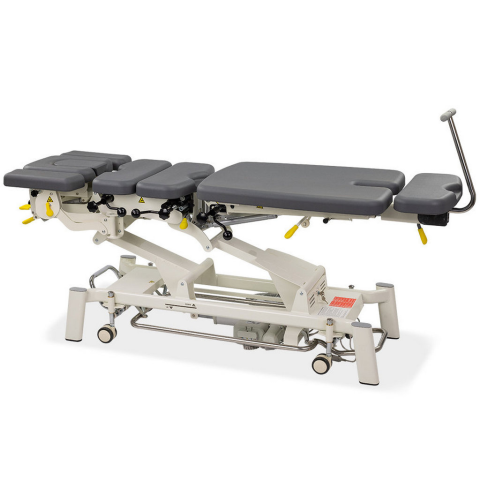 A többfunkciós, 7 szegmensű, fizioterápiás kezelésekhez készült ágy olyan speciális beállítási rendszerekkel rendelkezik, amelyek megkönnyítik a fizioterapeuta számára az egyes testrészekkel való munkát.