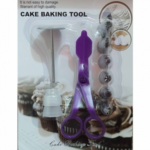 Cukorvirág tartó szög, cukorvirág átemelő olló, 6 darab habnyomófej és egy darab csatolócső.