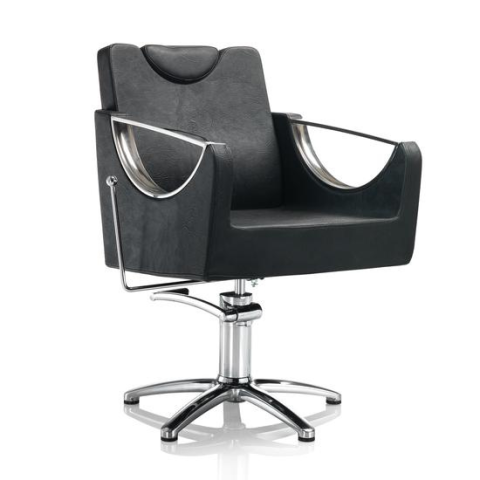 A Hair Crown fodrász szék krómozott vázzal, fekete műbőr kárpittal, csillag alakú talppal, és hidraulikus pumpával rendelkezik