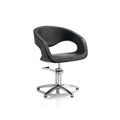 Elegáns és modern, könnyen tisztítható, fekete műbőrrel kárpitozott fodrász szék, krómozott forgó talppal, hidraulikus pumpával és fékkel