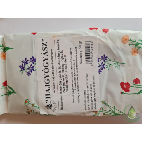 Hajgyógyász Androgén hajhullás elleni teakeverék. Javasolt fogyasztás: naponta 2-3 csészével. A teakészítés ajánlott módja:1. Külsőleg a haj leöblítésére és bedörzsölésére is ajánlott. 50 g Összetétel: Keserűfű gyökér, Szabalpálma termés, Zöld tea