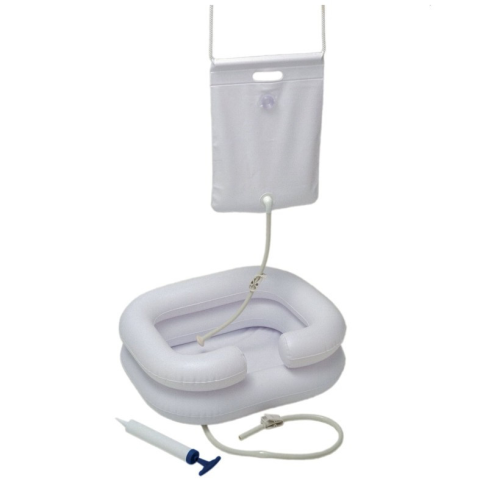 - szögletes hajmosó tál betegágyba - az ágyban elvégezhető a hajmosás - méret: 60x50 cm - magasság: 19 cm - felfújható - leeresztő nyílással - hajmosó tartállyal és zuhanyfejjel - pumpával