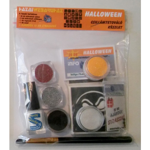 Tartalma: - 25 db különböző halloween sablon - 5 db különböző csillámpor (készletfüggő) - 1 db Extra csillámragasztó - 7 ml - 7-14 napos - 1 db ecset Fontos figyelmeztetés!!! A csillámtetoválás nem alkalmazható a szem vagy száj környékén. Az al