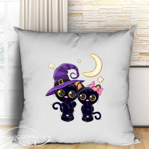 Halloweenre párna, macskás párna. Halloweeni párna két bűbájos cicával, akik garantáltan levesznek majd mindenkit a lábáról. Dekorálj vele te is ha Halloweeni hangulatod van. Tartós minta, mosógépben mosható huzat. A párna mérete 40x40 cm, a huzat pra