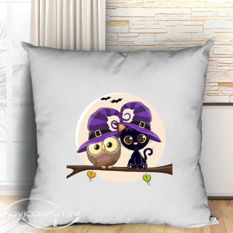 Halloweeni állatkák, párna halloweenre. Egy aranyos Halloweeni párna cica és bagoly mesefigurákkal. Nem kell minden Halloweeni dekorációnak ijesztőnek lenni, ha te is jobban szereted a cuki dolgokat ezt a párnát neked találtuk ki. Tartós minta, mosógépben