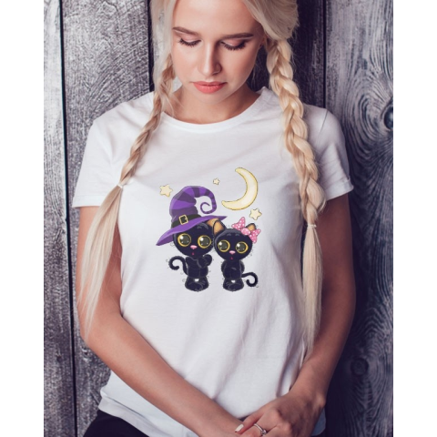 Halloweenre póló, macskás női póló. Halloweeni női póló két bűbájos cicával, akik garantáltan levesznek majd mindenkit a lábáról. Viseld te is ha Halloweeni hangulatod van. Tartós minta, mosógépben mosható 40 fokon. Kiváló minőségű férfi és női pólók,