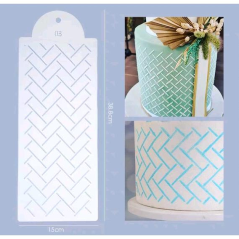 Téglalap alakú, parketta, vagy halszálka mintás, műanyag stencil, torták díszítéséhez, vagy egyéb kreatív hobbi tevékenységhez. A stencil teljes mérete 39 cm x 15 cm