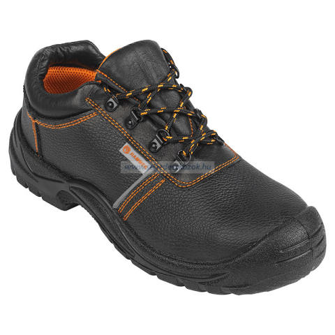 S3, SRC biztonsági félcipő Marhabőr felsőrész Megerősített, felhúzott orrész Acélkaplis, talplemezes Formázott talpbetét Olajálló, csúszásmentes kétrétegű PU fröccsöntött talp (SRC) Párnázott szártető és nyelv Külső oldalon fényvisszaverő csík Szín: feket