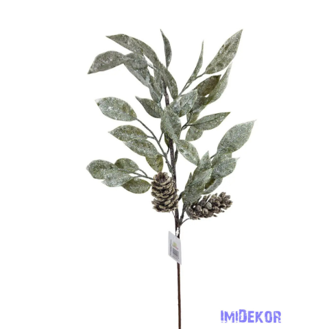 Hamvas csillámos leveles ág tobozzal dekorációs kellék 1 kép