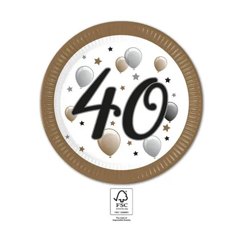 Happy Birthday 40 papírtányér 8 db-os 23 cm FSCAnyaga: papírMéret: 23 cm8 db tányér/csomagFSC (Forest Stewardship Council)