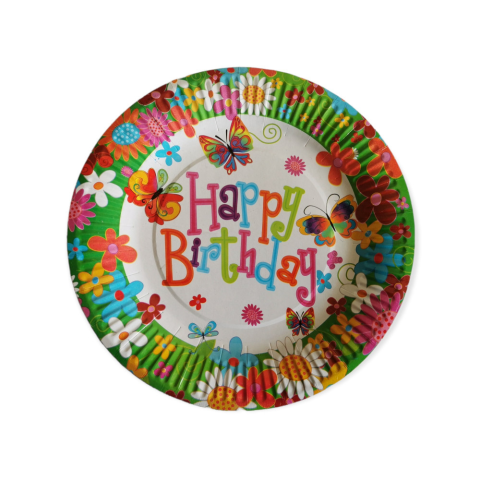 Happy Birthday papír tányér, virágok mintával 23 cm-es, 10 darab/csomag 10 darab Happy Birthday feliratú papírtányérok, virágok mintával, mellyel feldobhatod a szülinapi bulidat.