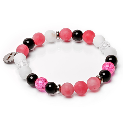 RUGALMAS KARKÖTŐ, a mérete választható. Az ékszer ásványai és tartozékai: – 8 mm-es matt pink jade ásványok – 8 mm-es fehér tűz achát gyöngyök – 8 mm-es fekete ónix gyöngyök – 8 mm-es pink és fehér roppantott hegyikristály