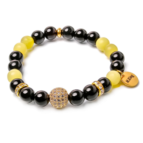 RUGALMAS KARKÖTŐ, a mérete választható.Az ékszer ásványai és tartozékai:– 8 mm-es sárga matt jade gyöngyök– 8 mm-es fekete ónix achát gyöngyök– 10 mm-es arany színű pavé strasszos dísz– Arany színű strasszos díszek– M.