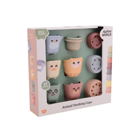 Fedezze fel a Happy World fürdőpoharak és egymásra rakható vödrök készletét, amelyek környezetbarát bioműanyagból készültek, hogy a fürdési idő játékos és tanulságos legyen.