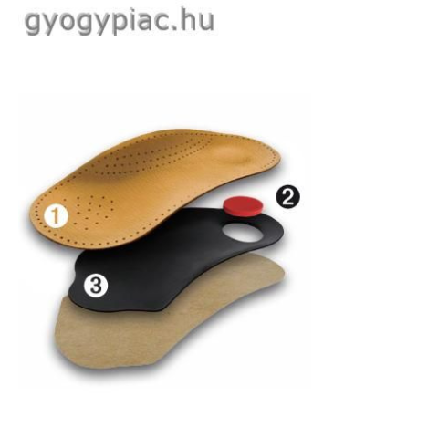 Juhbőr és speciális műanyagból készült, lágyék és enyhén harántemelős lúdtalpbetét, sarokággyal, öntapadós. Viselése csökkenti a harántcsontozatot és lúdtalp izomzatot ért terhelés okozta fájdalmakat. .