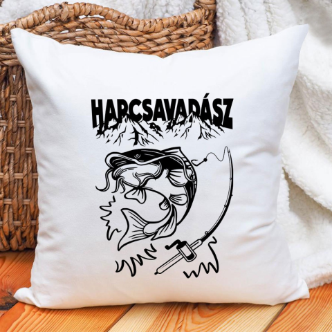 Harcsavadász párna, ajándék horgászoknak. Harcsavadász felirattal. Lepd meg pecás családtagodat, barátodat szülinapján, névnapján egy ilyen párnával. A párna hátuljának színét kiválaszthatod, az eleje fehér. Mérete 40x40 cm, húzózáras huzat, és puha párna