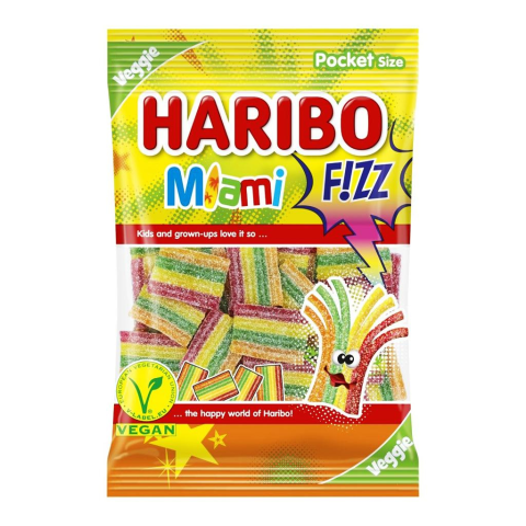 Haribo Miami F!zz gyümölcsízű gumicukor 85 gIde Figy!ZZ, savanykás, csíkos és vegán!